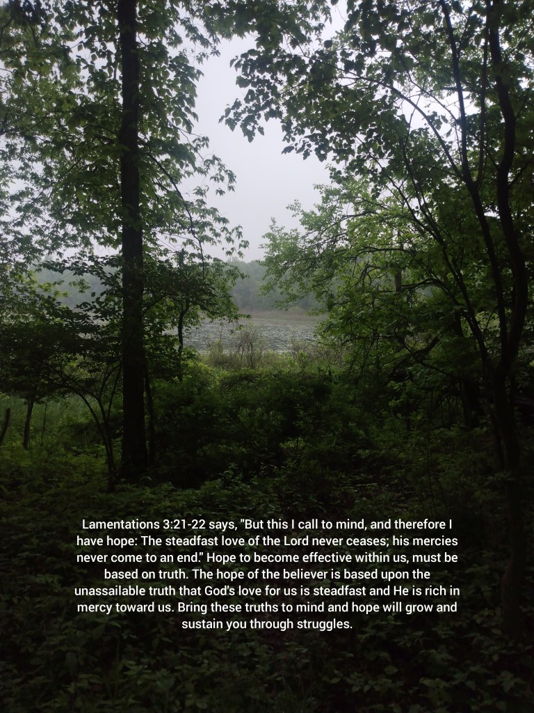Lamentations 3:21-22 says, “But this I call to mind, and therefore I have hope: The steadfast love of the Lord never ceases; his mercies never come to an end.” Hope to become effective within us, must be based on truth. The hope of the believer is based upon the unassailable truth that God’s love for us is steadfast and He is rich in mercy toward us. Bring these truths to mind and hope will grow and sustain you through struggles.