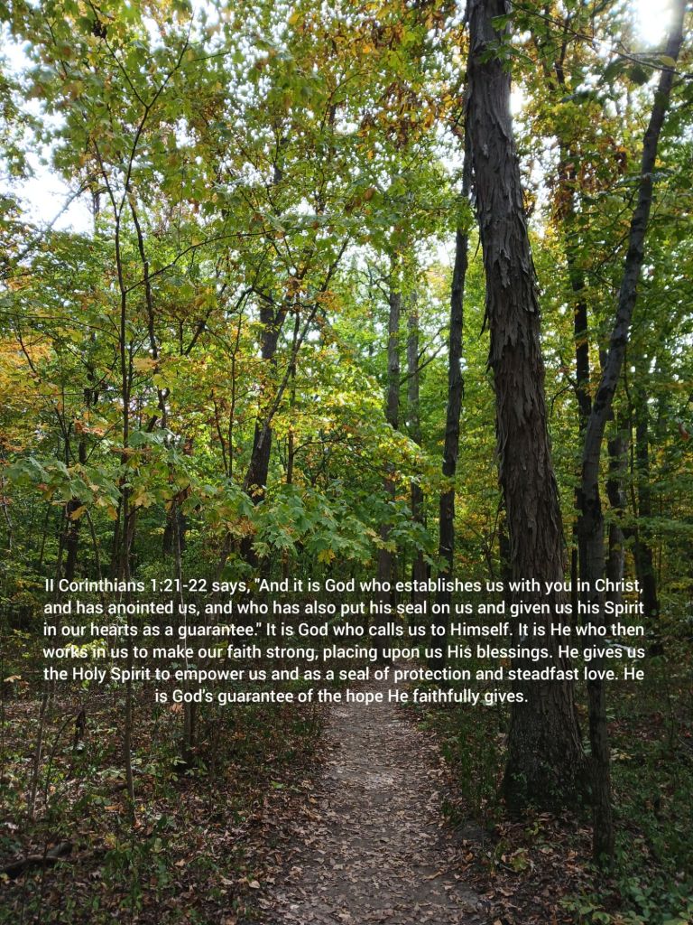 II Corinthians 1:21-22 says, “And it is God who establishes us with you in Christ, and has anointed us, and who has also put his seal on us and given us his Spirit in our hearts as a guarantee.” It is God who calls us to Himself. It is He who then works in us to make our faith strong, placing upon us His blessings. He gives us the Holy Spirit to empower us and as a seal of protection and steadfast love. He is God’s guarantee of the hope He faithfully gives.