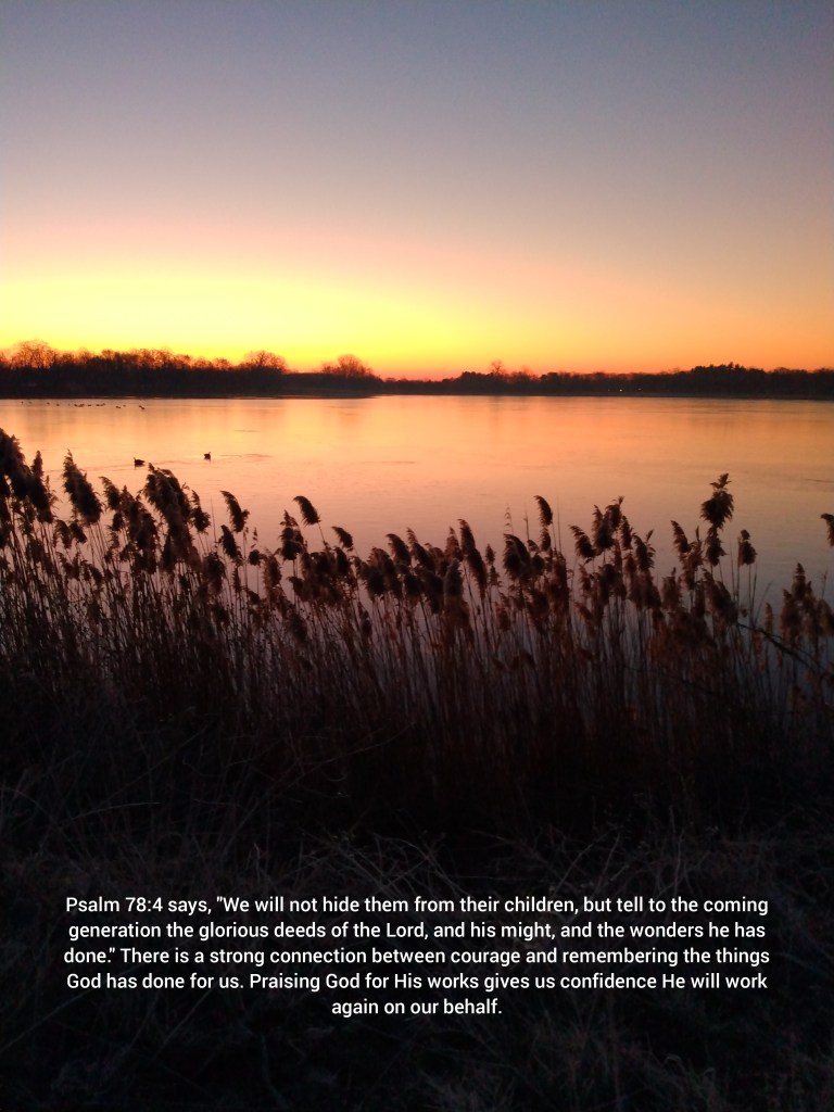 Psalm 78:4 says, “We will not hide them from their children, but tell to the coming generation the glorious deeds of the Lord, and his might, and the wonders he has done.” There is a strong connection between courage and remembering the things God has done for us. Praising God for His works gives us confidence He will work again on our behalf. He is a faithful God who can be trusted time and again.