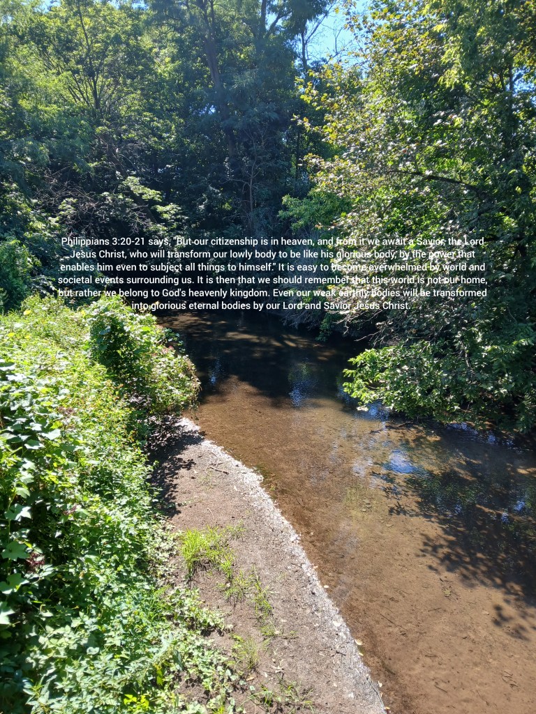 Philippians 3:20-21 says, “But our citizenship is in heaven, and from it we await a Savior, the Lord Jesus Christ, who will transform our lowly body to be like his glorious body, by the power that enables him even to subject all things to himself.” It is easy to become overwhelmed by world and societal events surrounding us. It is then that we should remember that this world is not our home, but rather we belong to God’s heavenly kingdom. Even our weak earthly bodies will be transformed into glorious eternal bodies by our Lord and Savior Jesus Christ.