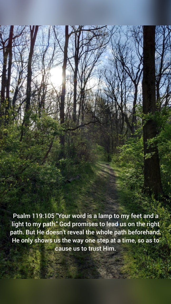 I hike nature trails almost every day. I love enjoying the outdoors and nature. God has revealed Himself to me in many ways on these hikes. One thing I have noticed is that I never see the whole trail at one time. Sometimes I can see more of the trail than others. How much I can see depends on the twists and turns of the trails and the obstacles in my way.