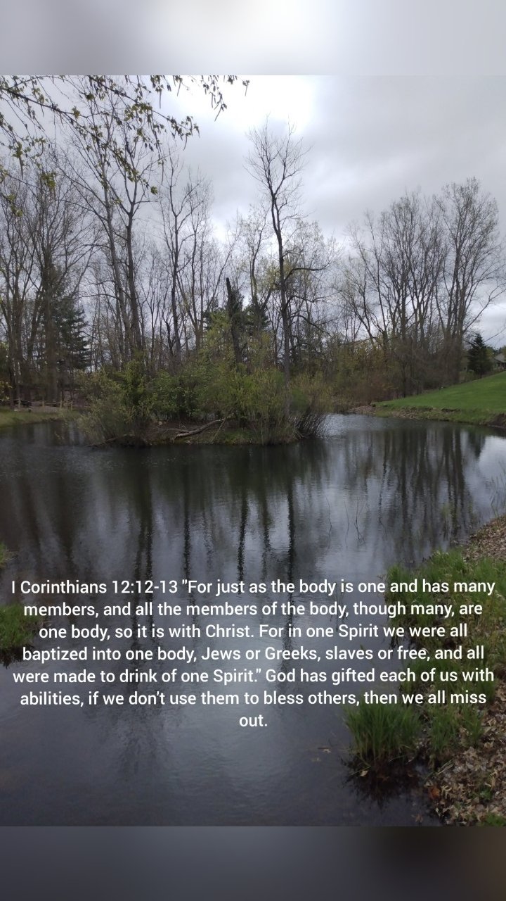 I Corinthians 12:12-13 says, “For just as the body is one and has many members of the body, though many, are one body, so it is with Christ. For in one Spirit we were all baptized into one body, Jews or Greeks, slaves or free, and all were made to drink of one Spirit.” As members of one body, the body of Christ, what we do affects the other members of the body. If we are hurting, the other members also suffer and come to serve the hurting. We are all blessed by God with certain gifts or abilities. If we don’t share those gifts with others, we all miss out on the blessings.