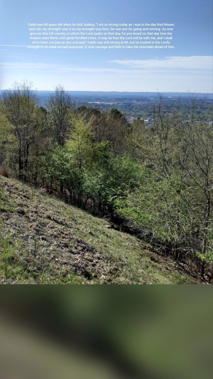 Caleb had already survived 40 years of wandering in the wilderness with his people. Then he fought with them for 5 more years. Now he wanted land for his family. He chose the most difficult land. It was hill country filled with giant people in well fortified cities. But Caleb had God’s promise that the land would be his. Although Caleb was still strong, he trusted that God’s strength would fulfill the promise. When we face a mountain of trouble that seems impossible to summit, we should trust in God’s strength to get us over the top of our struggle. Let’s not turn back toward comfort from our trouble, but rather move up the mountain in the strength of God.