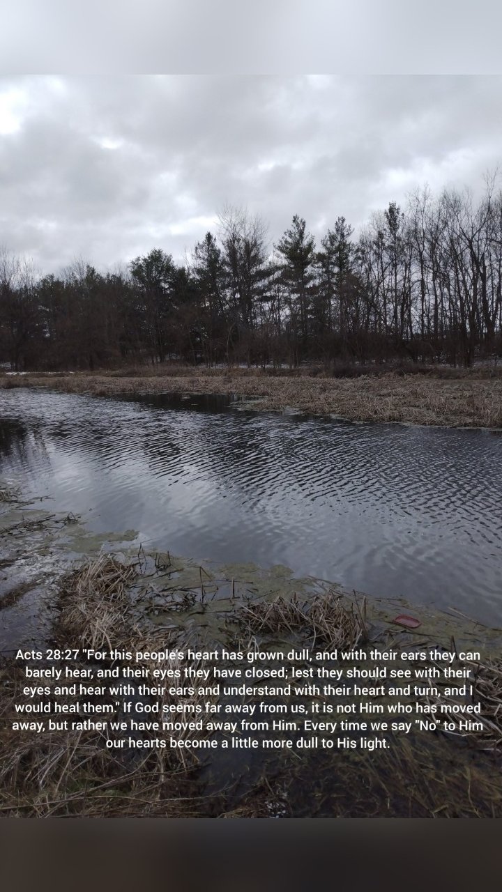 Paul quotes the prophet Isaiah when he says, “For this people’s heart has grown dull, and with their ears they can barely hear, and their eyes they have closed; lest they should see with their eyes and hear with their ears and understand with their heart and turn, and I would heal them.” If God seems distant to you, perhaps your heart has become dull as you have said “No” to Him recently or repeatedly. Examine your heart to see if you have rejected Him in some way and thereby have moved away from Him. He is worth hearing. His works are worth seeing.