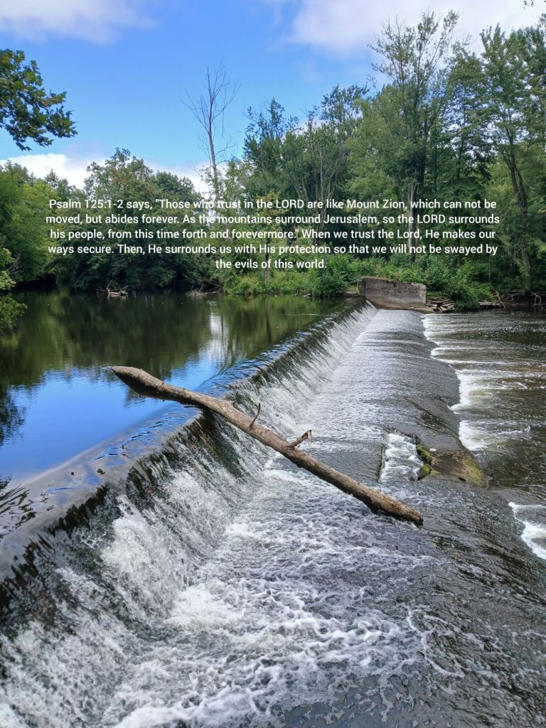 Psalm 125:1-2 says, “Those who trust in the LORD are like Mount Zion, which can not be moved, but abides forever. As the mountains surround Jerusalem, so the LORD surrounds his people, from this time forth and forevermore.” When we trust the Lord, He makes our ways secure. Then, He surrounds us with His protection so that we will not be swayed by the evils of this world.