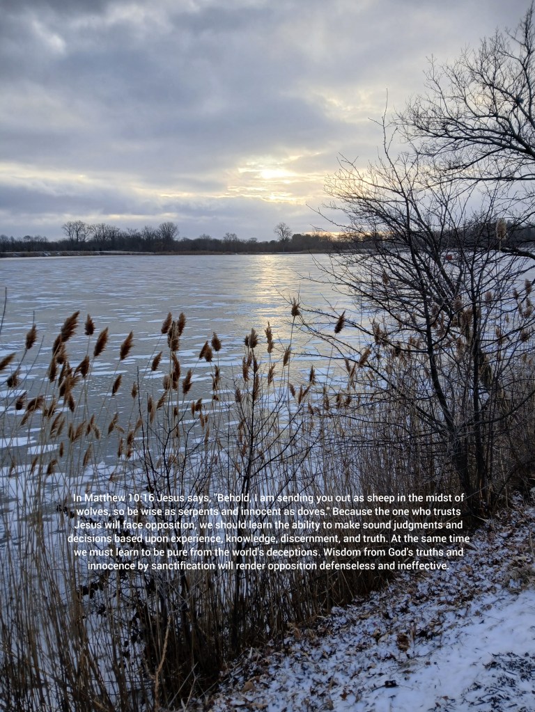 In Matthew 10:16 Jesus says, “Behold, I am sending you out as sheep in the midst of wolves, so be wise as serpents and innocent as doves.” Because the one who trusts Jesus will face opposition, we should learn the ability to make sound judgments and decisions based upon experience, knowledge, discernment, and truth. At the same time we must learn to be pure from the world’s deceptions. Wisdom from God’s truths and innocence through godly sanctification will render opposition defenseless and ineffective.