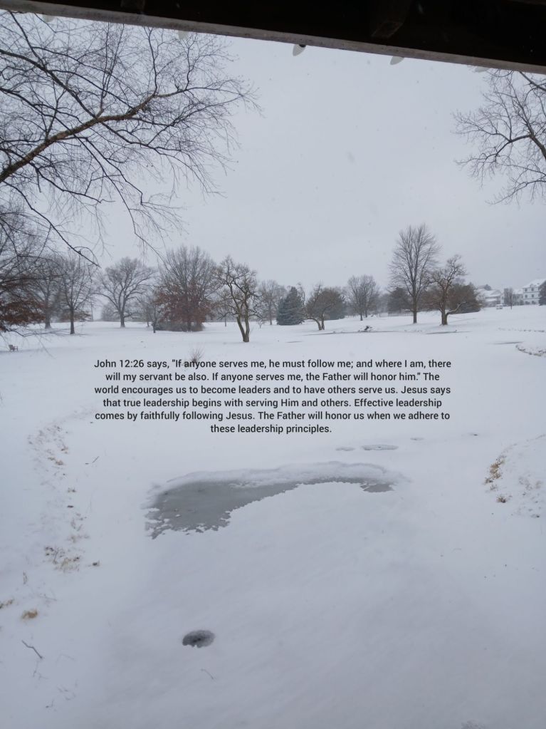 John 12:26 says, “If anyone serves me, he must follow me; and where I am, there will my servant be also. If anyone serves me, the Father will honor him.” The world encourages us to become leaders and to have others serve us. Jesus says that true leadership begins with serving Him and others. Effective leadership comes by faithfully following Jesus. The Father will honor us when we adhere to these leadership principles.