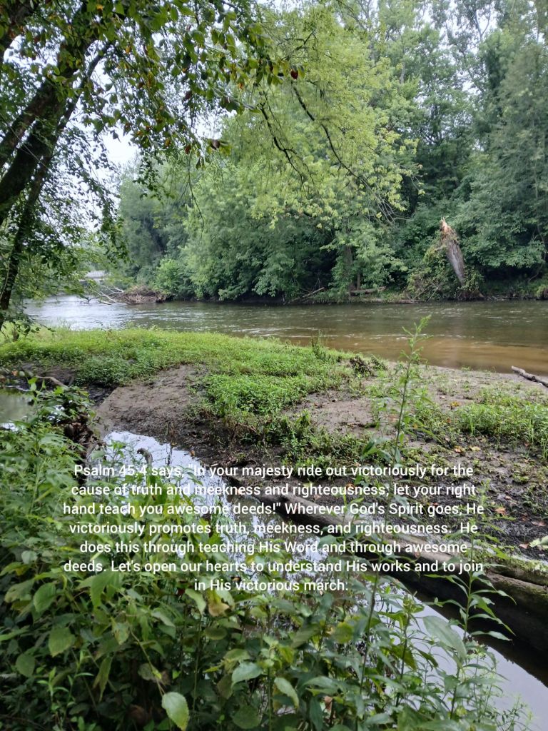 Psalm 45:4 says, “In your majesty ride out victoriously for the cause of truth and meekness and righteousness; let your right hand teach you awesome deeds!” Wherever God’s Spirit goes, He victoriously and majestically promotes truth, meekness, and righteousness. He does this through teaching His Word and through awesome deeds. Let’s open our hearts to understand His works and to join in His victorious march.