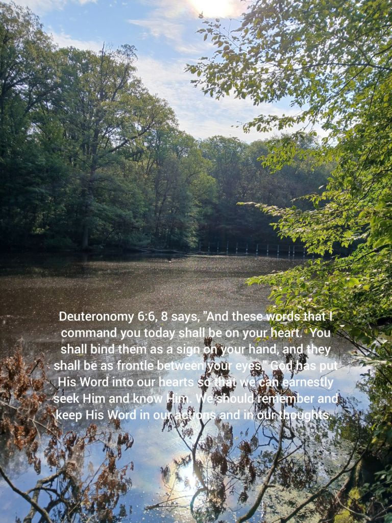 Deuteronomy 6:6, 8 says, “And these words that I command you today shall be on your heart. You shall bind them as a sign on your hand, and they shall be as frontle between your eyes.” God has put His Word into our hearts so that we can earnestly seek Him and know Him. We should remember and keep His Word in our actions and in our thoughts.